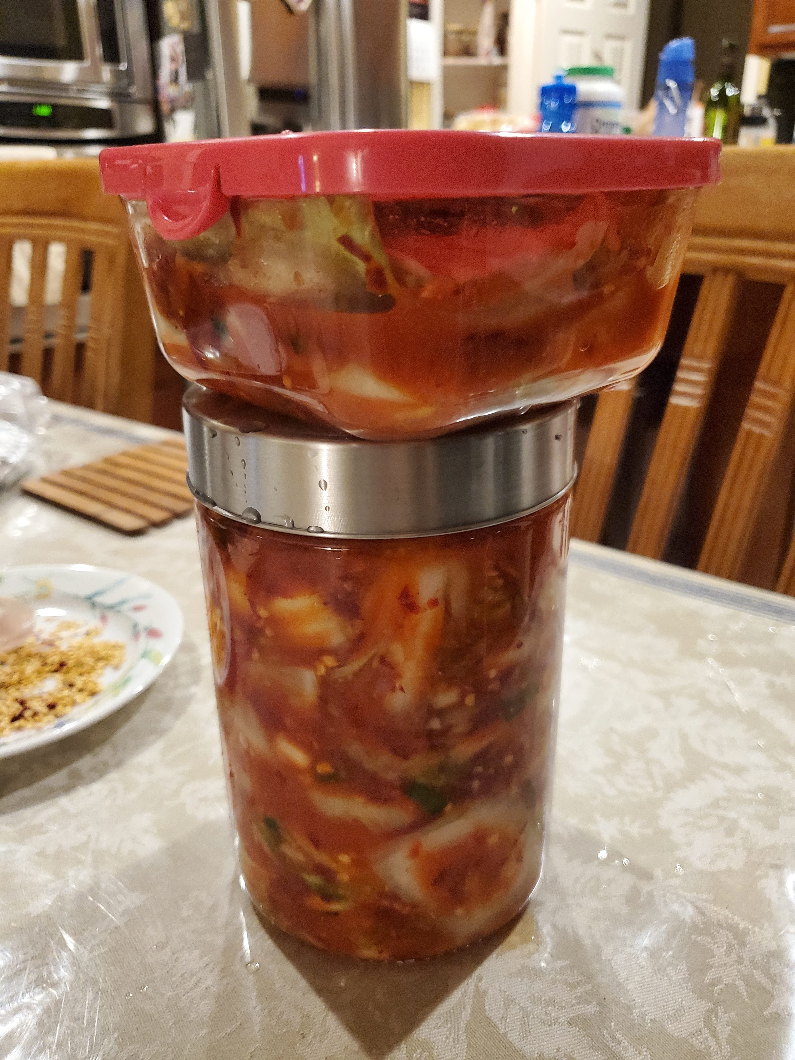 Leave the sealed jar outside to ferment. Feel free to taste every day. After a couple days, the flavor should take on the sharp acidity of lactic acid. That means the good ol' lactobax are doing their job, converting sugars into lactic acid. The acidity will inhibit mold and help preserve the kimchi. Refrigerate when the texture reaches your personal preference. Some people like to ferment quickly to preserve the crunchy texture, while others like to let it ride to get more funky flavor.